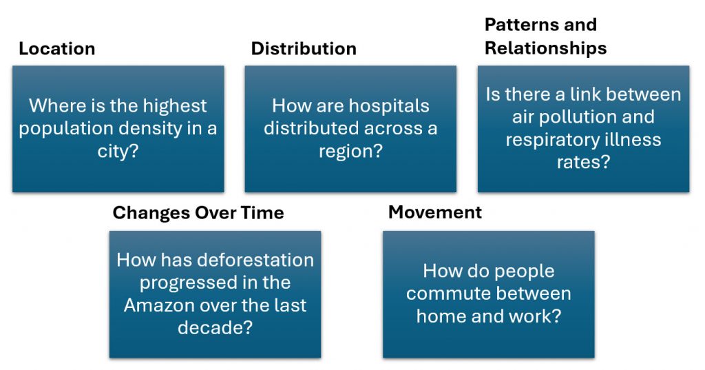 Spatial analysis goes far beyond plotting points on a map. It’s about using spatial data to see, measure, and explain patterns that aren’t obvious at first glance. But before we analyze anything, we start by asking spatial questions; questions that focus on where things are, why they are there, and how they relate to other things in space.
