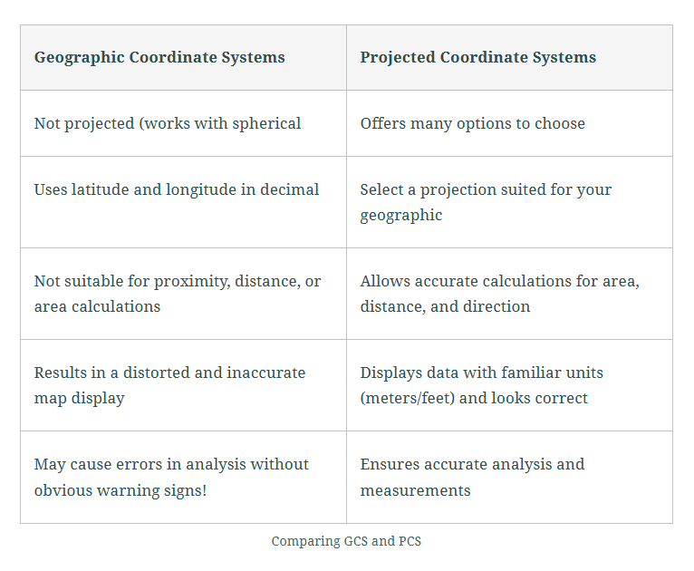 People often use ‘Projected Coordinate Systems’ and ‘Projections’ as if they mean the same thing, but they’re actually different. A projection is just one part of a projected coordinate system. Other important components include the geographic coordinate system, a linear unit (like meters or feet), and specific settings related to the chosen projection, such as the central meridian or scale factor.
